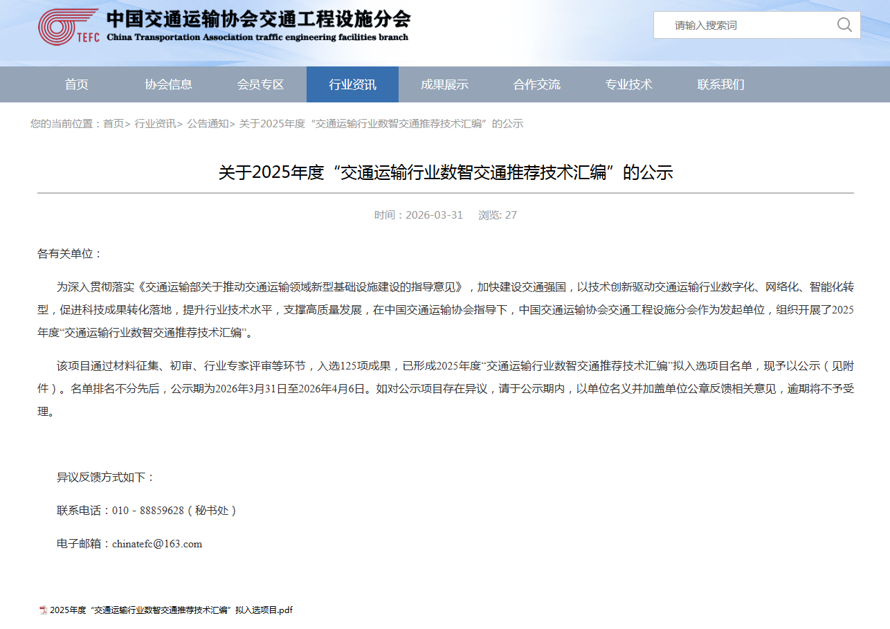 2026年3月31日,中国交通运输协会交通工程设施分会发布了《关于2025年度“交通运输行业数智交通推荐技术汇编”的公示》。由我公司参与研发的“高等级公路智慧建管养运一体化关键技术”成功入选。